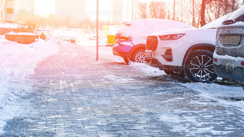 Автомобили, припаркованные вдоль тротуара зимой, Автомобили, припаркованные в ряд на открытой парковке. Ряды разных автомобилей припаркованы вдоль обочины в холодный день. Автомобили припаркованы на открытой стоянке. Никто, уличное фото