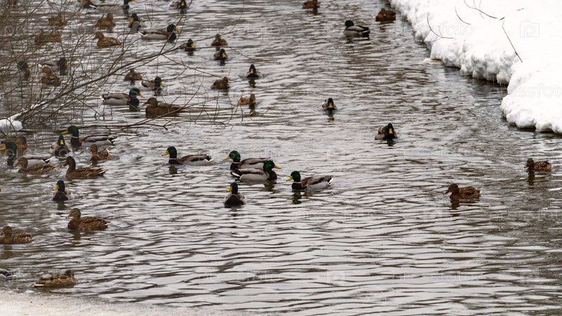 Утки на зимнем пруду, Утки на зимнем пруду, Утки на замерзшем пруду в солнечный зимний день, Кормление и плавание утиных стад. кряква в пруду в свете зимнего утра
