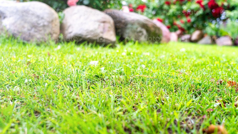 Красивая газонная трава и каменный фон на лужайке, фон для дизайна, большой камень, лежащий на лужайке, солнечная вспышка, тонированное изображение, заготовка для дизайна, задний двор