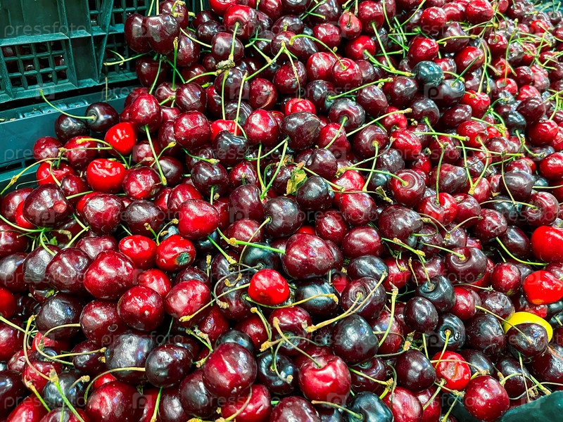 Вишня в супермаркете, сезон летних ягод и фруктов, вишня на рынке, фермерский рынок антиоксидантов
