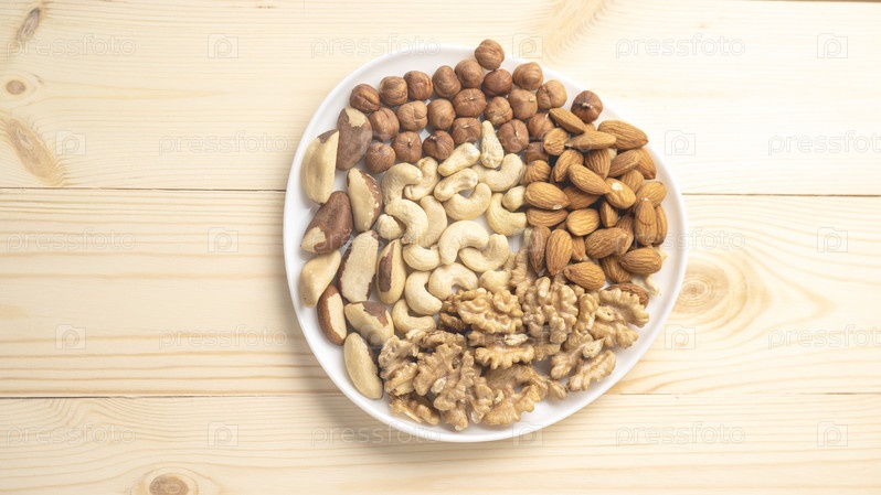 Белая тарелка с орехами на деревянном фоне, ядра грецких орехов, очищенный сушеный фундук, миндаль и кешью, вид сверху, концепция здорового и полезного питания