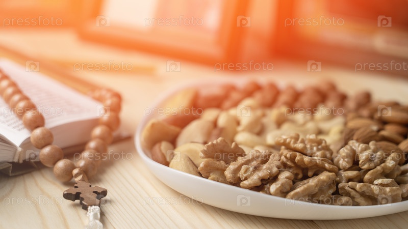 Православная еда, Традиционная еда православных христиан. Орехи. Керамика. Православные четки и иконы на заднем плане