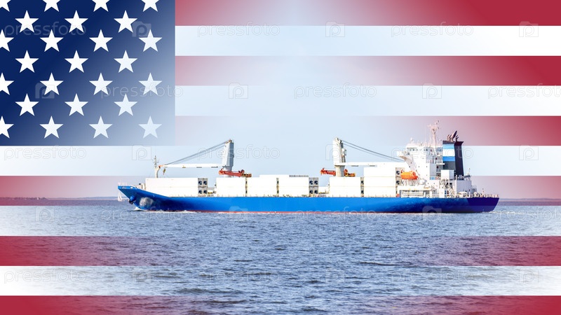 Корабль-контейнеровоз на фоне флага США, Концепция грузоперевозок по морю, доставка товаров в Соединенные Штаты Америки, экспорт и импорт по морю,