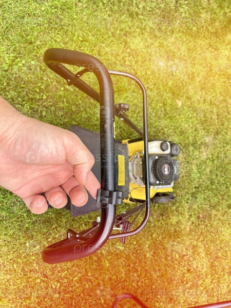 Газонокосилка и тачка для стрижки травы, скашивания травы с газона, солнечный летний день, желтая тележка для газонокосилки и травы,
