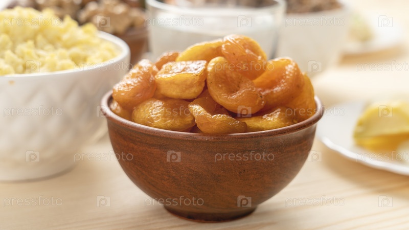 Курага в глиняной чашке, концепция здорового и здорового питания