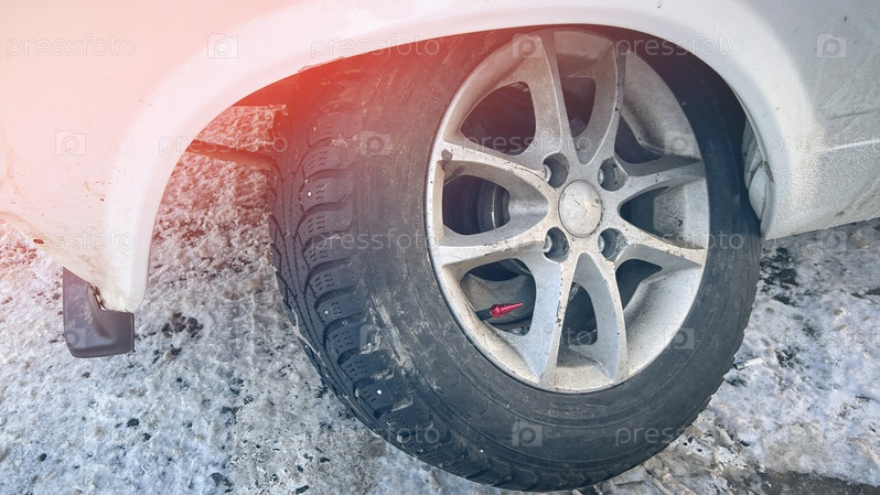 Колесо автомобиля погнулось, сильно искрило, последствия наезда на выбоину на зимней дороге. Колесо автомобиля вывернуло от сильного удара, у автомобиля сломалось переднее колесо