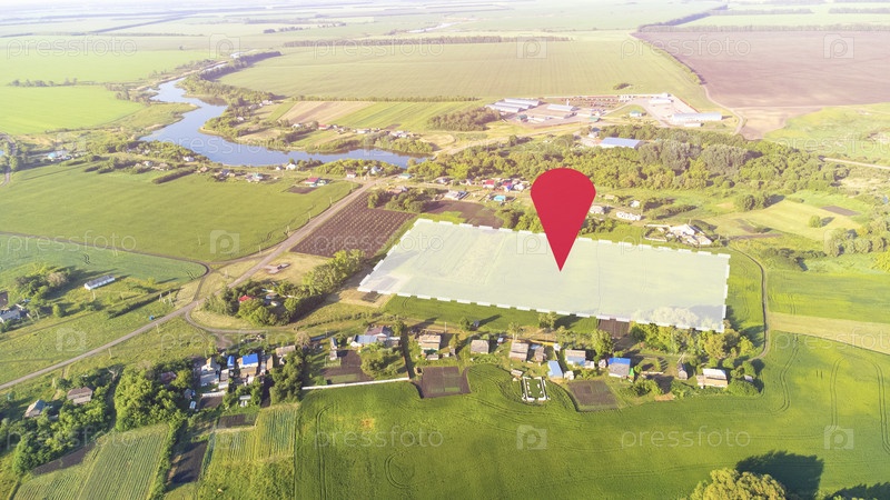 Земельный участок на продажу, вид сверху, расположение точки и границы, чтобы показать местоположение и площадь. Земельный участок в собственности, продажа, застройка, аренда