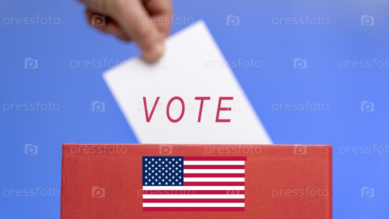 Выборы в США, урна для голосования и флаг Соединенных Штатов Америки, концепция президентских выборов