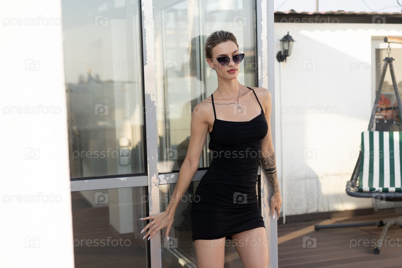 Молодая красивая женщина позирует в черном коротком платье на улице