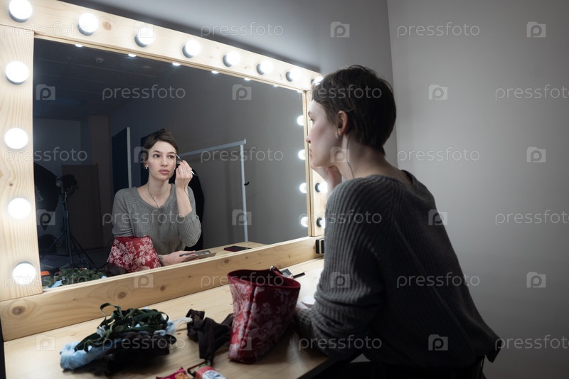 Молодая красивая женщина наносит макияж возле зеркала