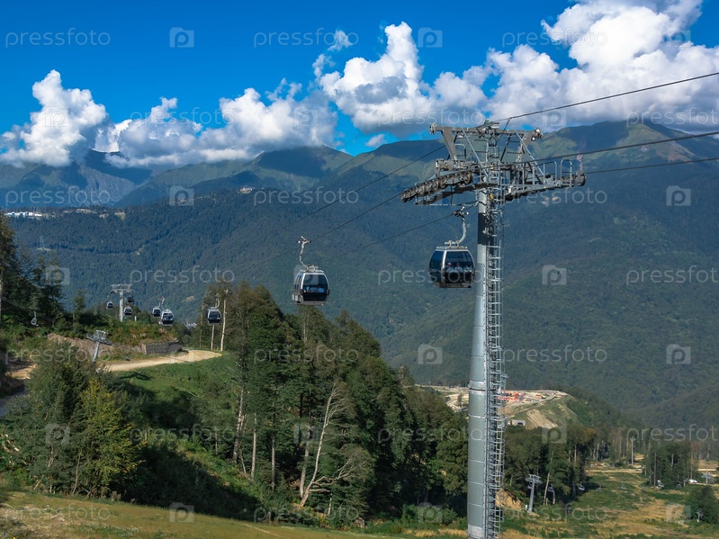Экстремальная поездка на канатной дороге в горах. Зеленые склоны гор. Летний отдых