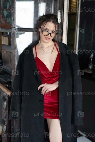 Молодая красивая женщина позирует в коротком красном платье в студии