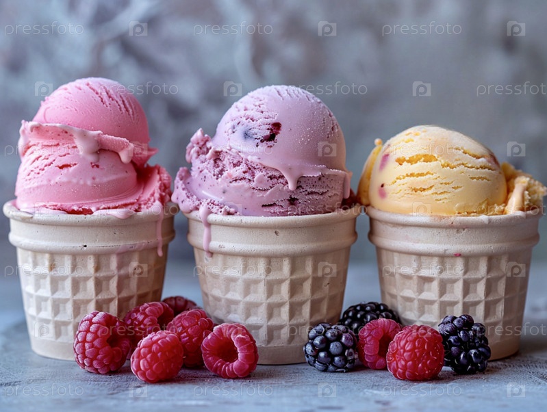 На ярком столе стоят три вафельных стаканчика с мороженым из манго, малины и ежевики, рядом со свежими ягодами