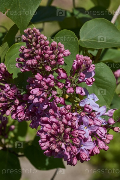 Цветочные соцветия появились из бутонов сирены (лат. Syringa vulgaris) в лучах весеннего солнца