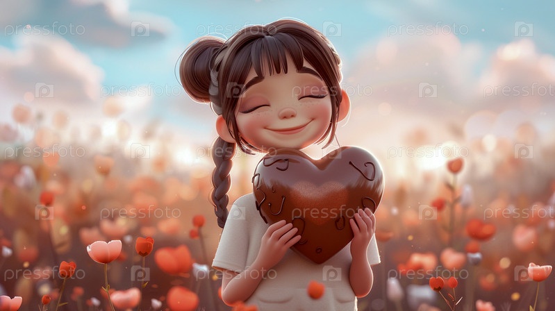 Маленькая счастливая девочка с закрытыми глазами, стоящая в поле с маками на фоне голубого неба и держащая в руках огромное шоколадное сердце, Счастливый шоколадный день