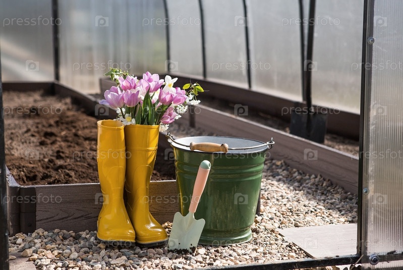 Желтые резиновые сапоги с букетом весенних тюльпанов и нарциссов. Ведро и маленькая лопатка в новой теплице. Концепция весенней посадки овощей и сельского хозяйства