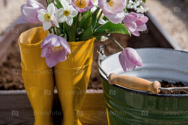 Желтые резиновые сапоги с букетом весенних тюльпанов и нарциссов. Ведро и маленькая лопатка в новой теплице. Концепция весенней посадки овощей и сельского хозяйства