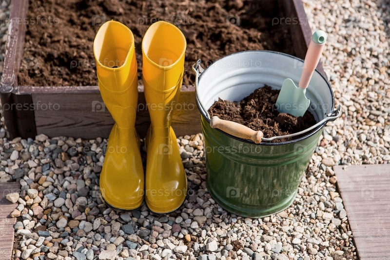 Желтые резиновые сапоги, ведро и небольшая лопата в новой теплице. Концепция весенней посадки овощей и земледелия