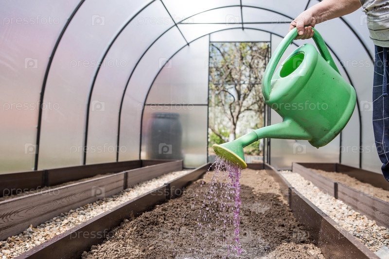 Руки пожилой женщины держат лейку. Фермер поливает огород растворами марганцовки от болезней и вредителей перед высадкой рассады в грунт. Крупный план. Концепция весенней посадки овощей и сельского хозяйства