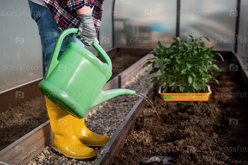 Руки пожилой женщины держат лейку. Рассаду болгарского перца высаживают в грунт. Фермер поливает сад. Крупный план. Концепция весенней посадки овощей и сельского хозяйства