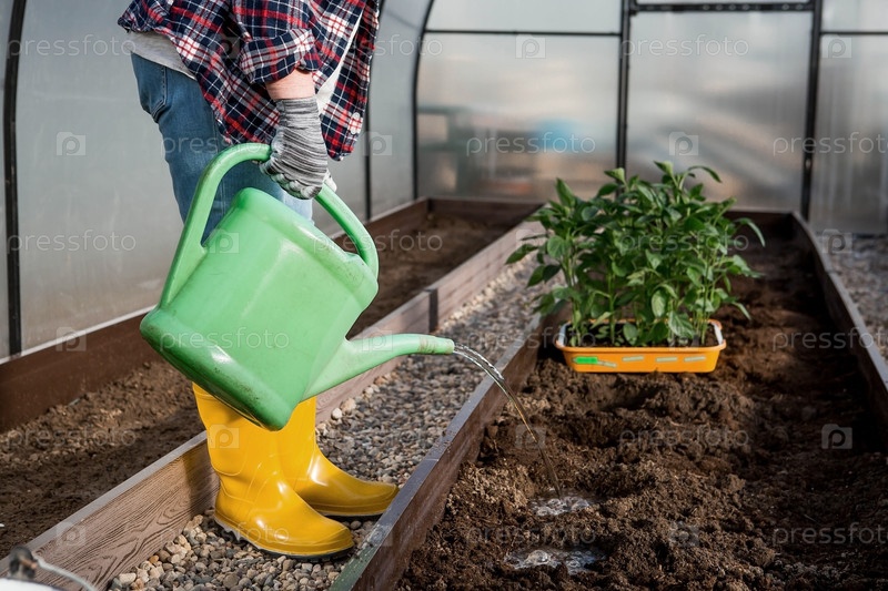 Руки пожилой женщины держат лейку. Рассаду болгарского перца высаживают в грунт. Фермер поливает сад. Крупный план. Концепция весенней посадки овощей и сельского хозяйства