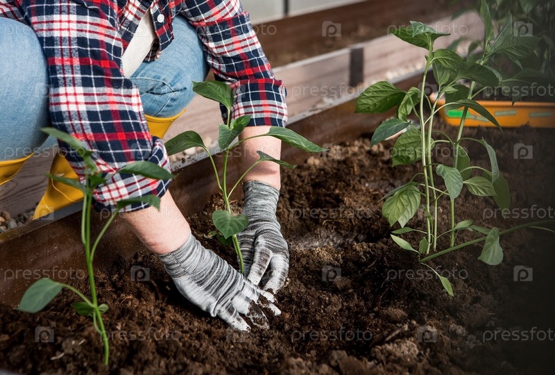 Руки пожилой женщины держат в земле молодое растение. Рассада болгарского перца высаживается в почву. Крупный план. Концепция весенней посадки овощей и сельского хозяйства