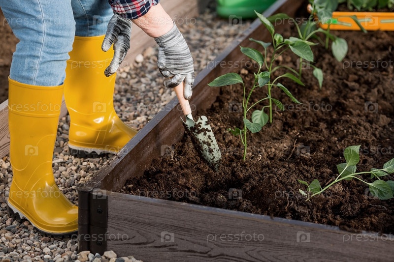 Руки пожилой женщины держат в земле молодое растение. Рассада болгарского перца высаживается в почву. Крупный план. Концепция весенней посадки овощей и сельского хозяйства