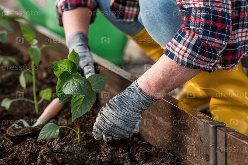 Руки пожилой женщины держат в земле молодое растение. Рассада болгарского перца высаживается в почву. Крупный план. Концепция весенней посадки овощей и сельского хозяйства