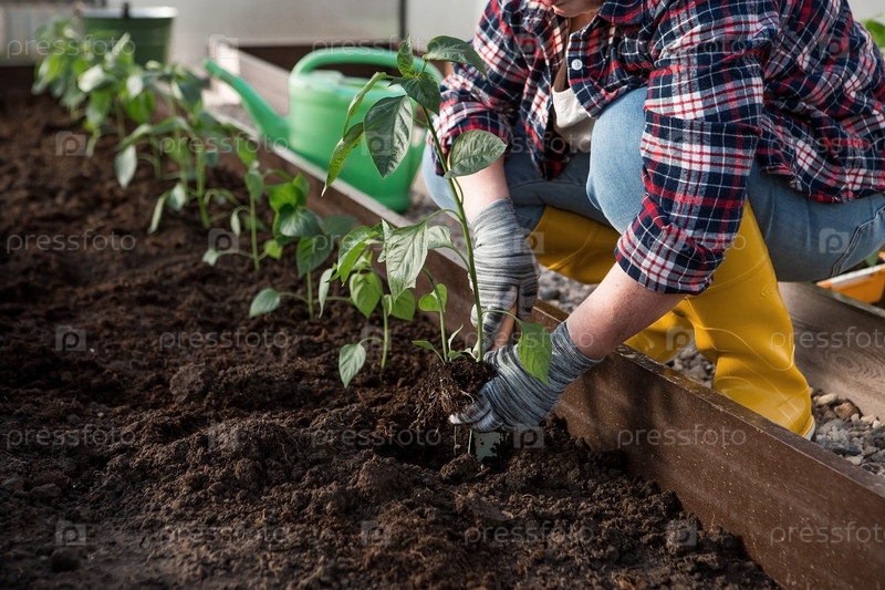 Руки пожилой женщины держат в земле молодое растение. Рассада болгарского перца высаживается в почву. Крупный план. Концепция весенней посадки овощей и сельского хозяйства