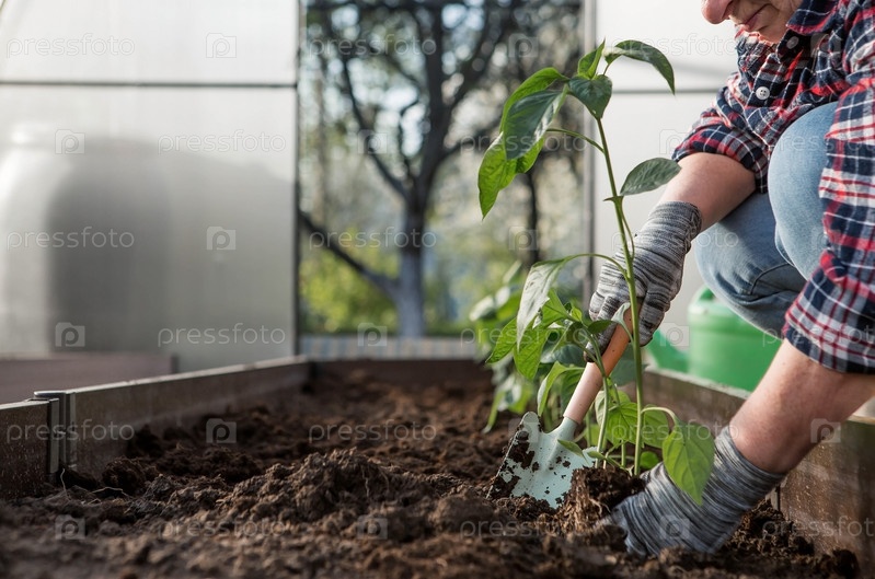 Руки пожилой женщины держат в земле молодое растение. Рассада болгарского перца высаживается в почву. Крупный план. Концепция весенней посадки овощей и сельского хозяйства