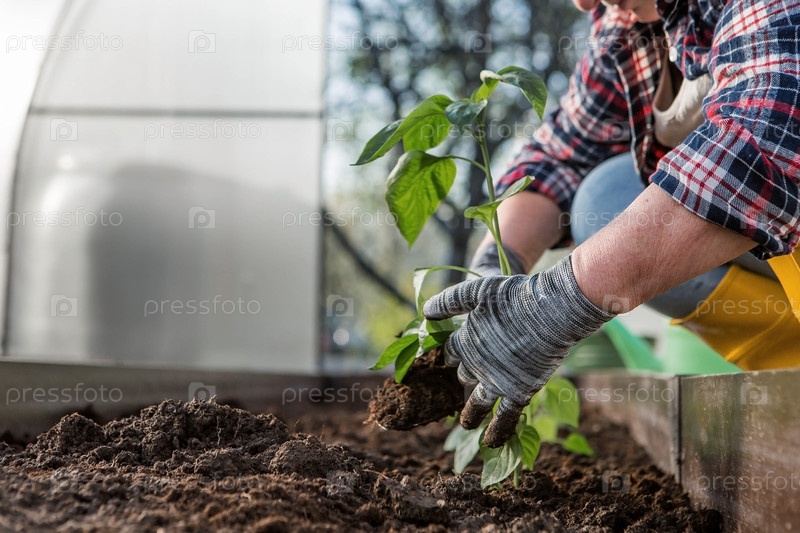 Руки пожилой женщины держат в земле молодое растение. Рассада болгарского перца высаживается в почву. Крупный план. Концепция весенней посадки овощей и сельского хозяйства