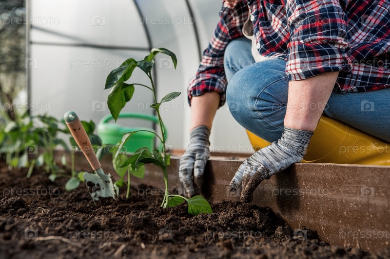 Руки пожилой женщины держат в земле молодое растение. Рассада болгарского перца высаживается в почву. Крупный план. Концепция весенней посадки овощей и сельского хозяйства