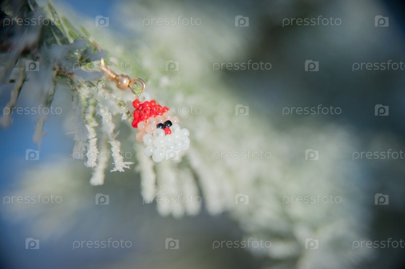 Дед Мороз из бисера стоит на заснеженной ветке елки