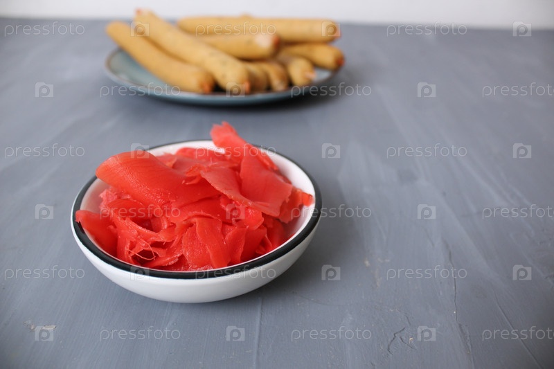 Красный маринованный имбирь на тарелке. Пряная восточная приправа. Пищевые добавки