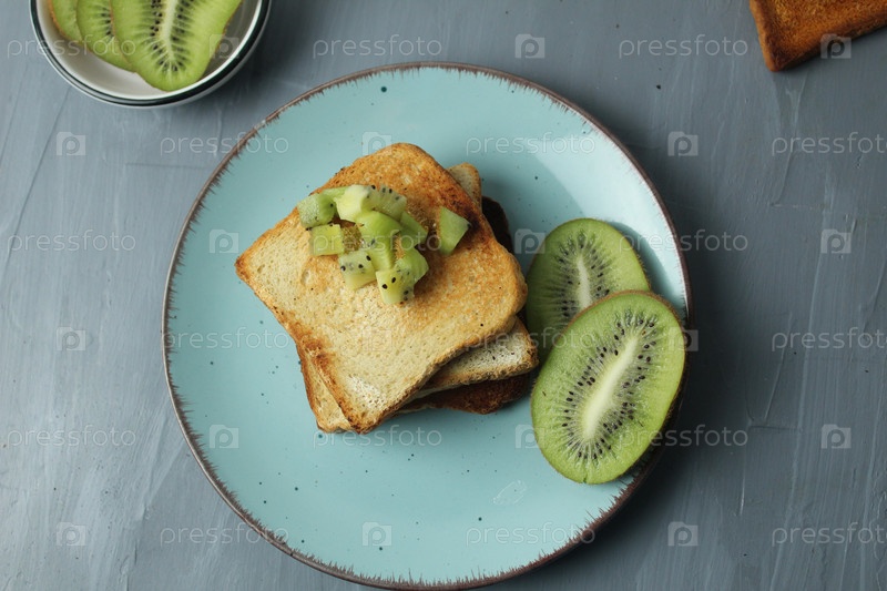 Хлеб киви на тарелке на сером фоне с местом для текста. Здоровый завтрак с фруктами