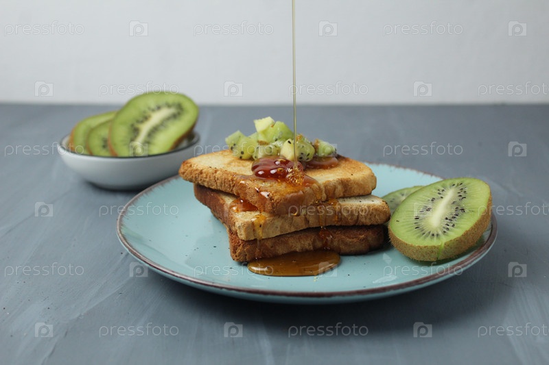 Мед, налитый на тост с фруктами на тарелке на сером фоне с местом для текста. Здоровый завтрак