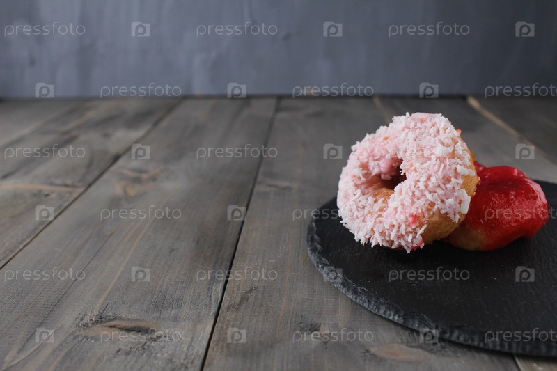 Круглые пончики с белой кокосовой посыпкой на сером фоне с местом для копирования текста. День пончика