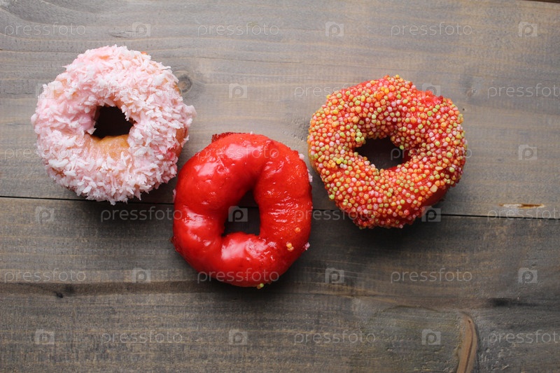 Три пончика красный, розовый, белый, глазурованные на сером фоне с местом для текста. День пончиков – это сахарная еда. Сахар в продуктах питания Плохие углеводы