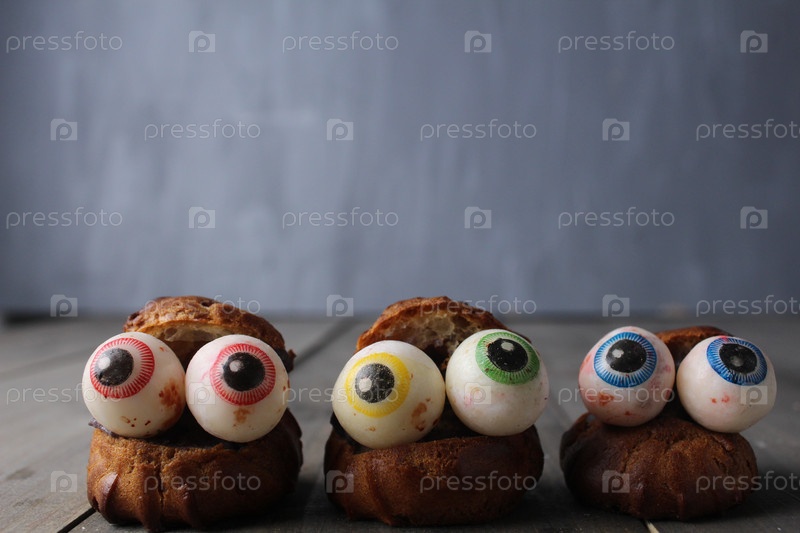 Торты эклеры с глазами на сером фоне с местом для текста. Готовим к Хэллоуину. Смешная и страшная еда
