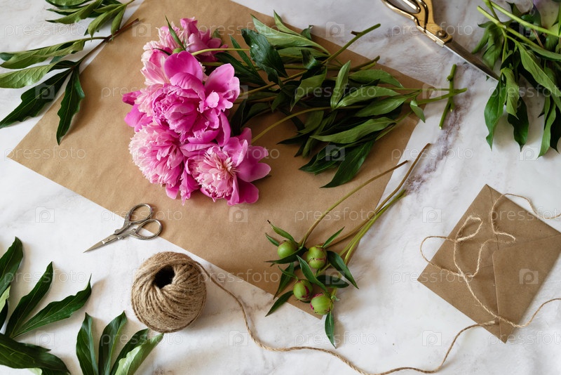 Женщина-флорист делает на своем рабочем столе букет цветов пиона, завернутый в крафт-бумагу. Вид сверху. Фотографии высокого качества
