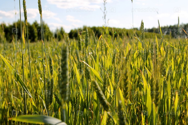 Пшеничное поле в летний день. Фон созревающих колосьев пшеничного поля