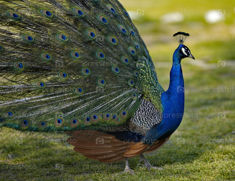 Россия. Дагестан. Портрет самца павлина с великолепным распущенным хвостом в мини-зоопарке недалеко от знаменитой дюны Сарыкум
