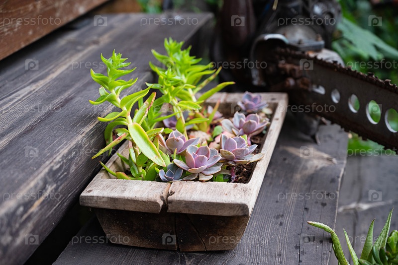 Миска в горшке с искусственными суккулентами в качестве простого домашнего декора на деревянном подносе в доме, сдаваемом в краткосрочную аренду