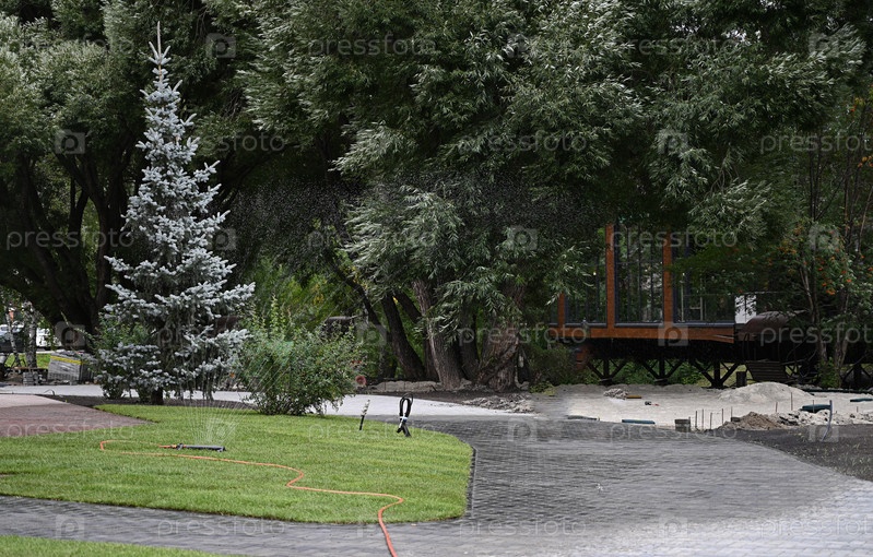 Живописный вид на красивый ландшафтный сад в английском стиле с зеленой скошенной лужайкой и красочной клумбой