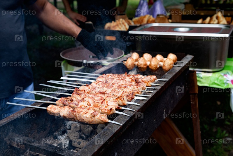 Вкусный процесс приготовления шашлыка. Мясо на гриле