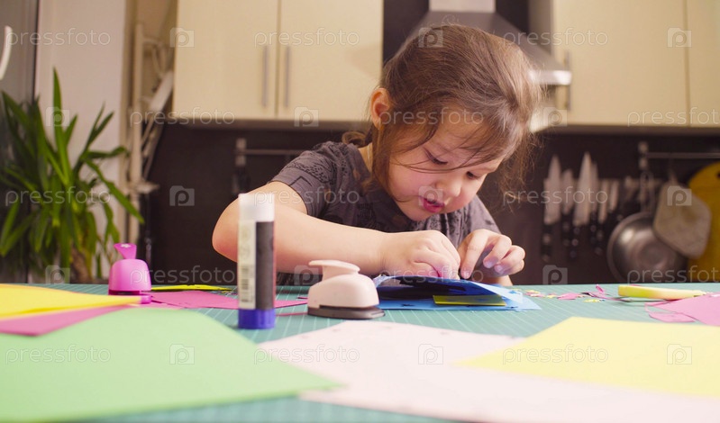 Скрапбукинг. Маленькая девочка клеит цветную бумагу