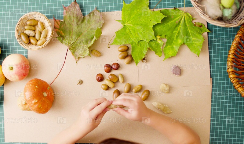 Маленькая девочка делает ожерелье из желудей