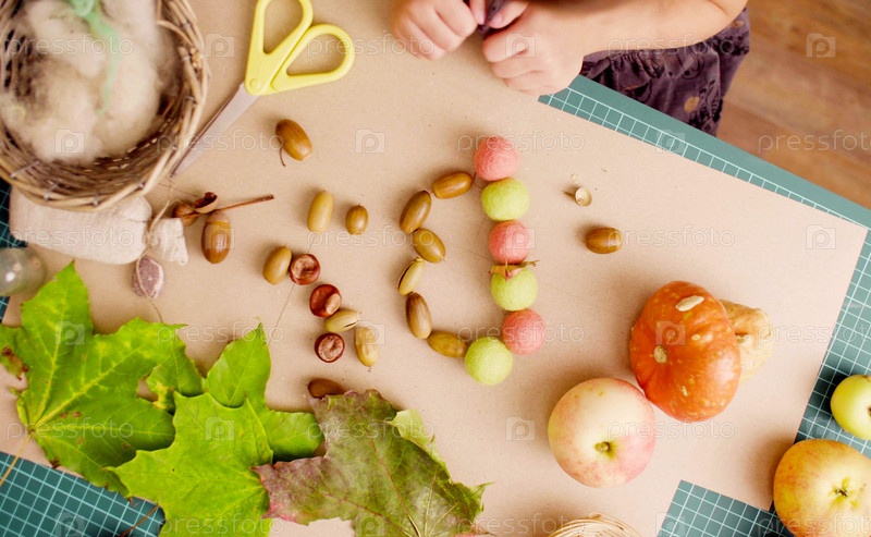 Маленькая девочка, сидящая за столом, делает ожерелье из желудей