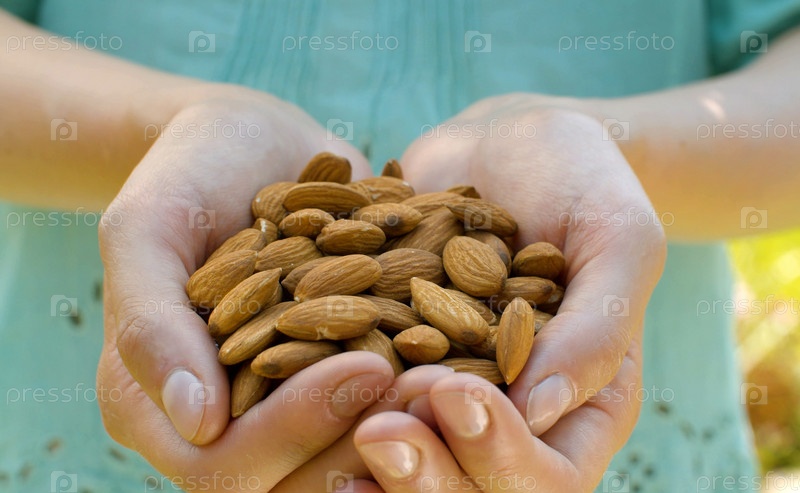 Миндальные орехи в женских руках крупным планом. Продукт богат минералами и витаминами