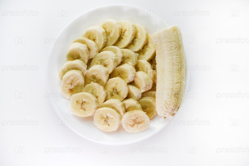 Нарезанные бананы на белой тарелке. Вкусные и сочные фрукты. Завтрак на тарелке